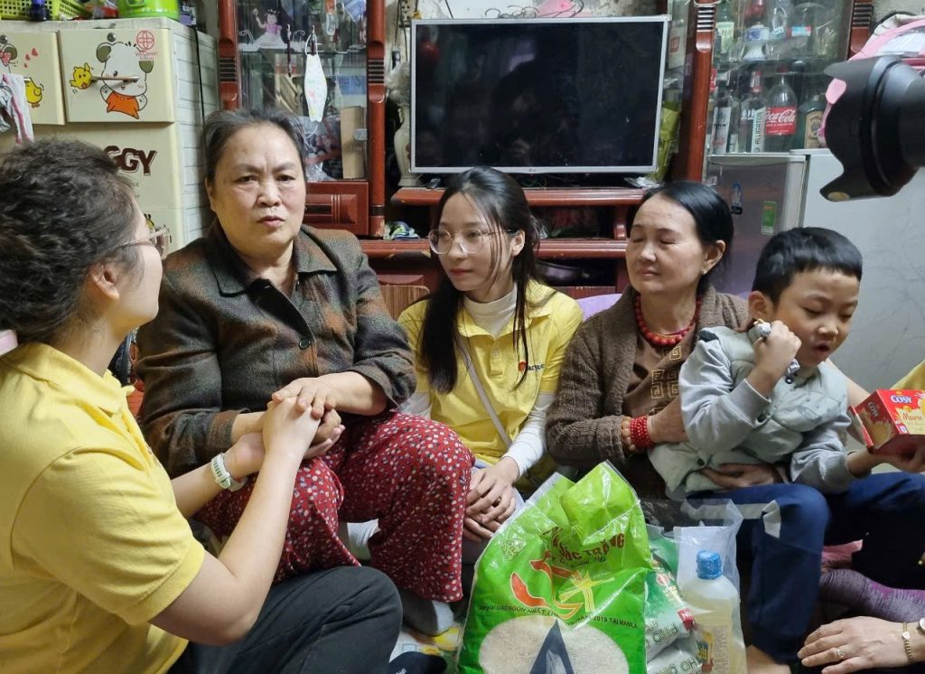 Tiếp đó các thanh niên Phật tử đến thăm và tặng quà cho gia đình bà Nguyễn Thị Hà bị bệnh tiểu đường nặng, mờ hai mắt đang phải nuôi cháu mồ côi bị câm và tăng động và thăm gia đình ông Nguyễn Đình Hoàn cựu thanh niên xung phong không có sức khỏe , đây là các hộ gia đình đặc biệt khó khăn nhất tại Quận Hai Bà Trưng, mỗi xuất quà gồm gạo, can dầu ăn , phở khô, muối gia vị phong bì …trị giá mỗi xuất tám trăm ngàn đồng.