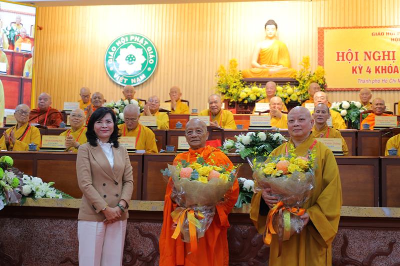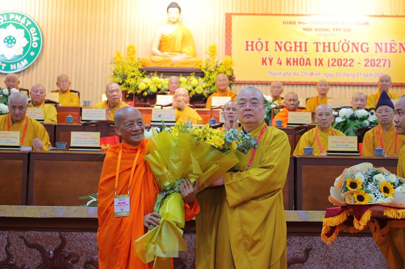 Nhân dịp này Trưởng lão Hoà thượng Tăng Nô (Viniya Tharo) và Hòa thượng Thích Lệ Trang – Phó Chủ tịch Hội đồng Trị sự GHPGVN đón nhận lẵng hoa của HĐCM, HĐTS cùng các Ban ngành lãnh đạo trao tặng chúc mừng