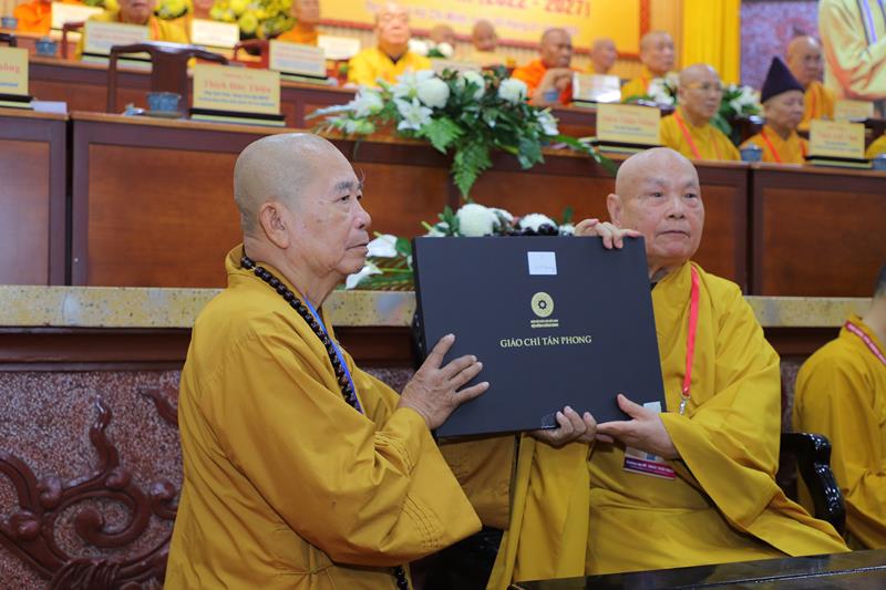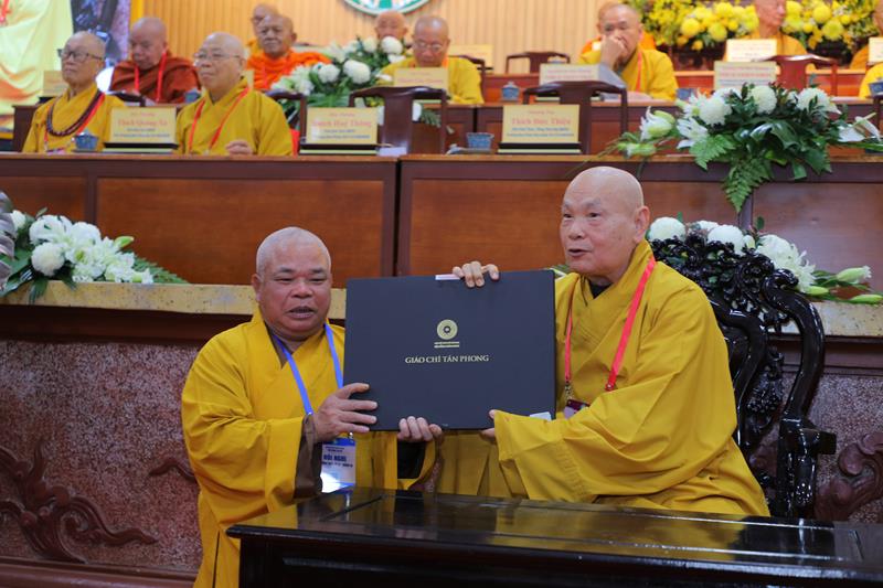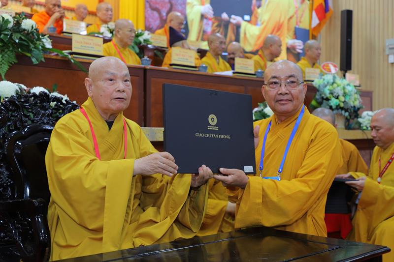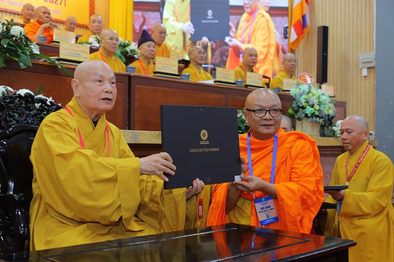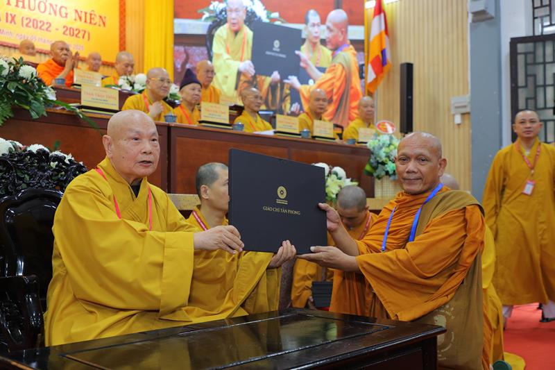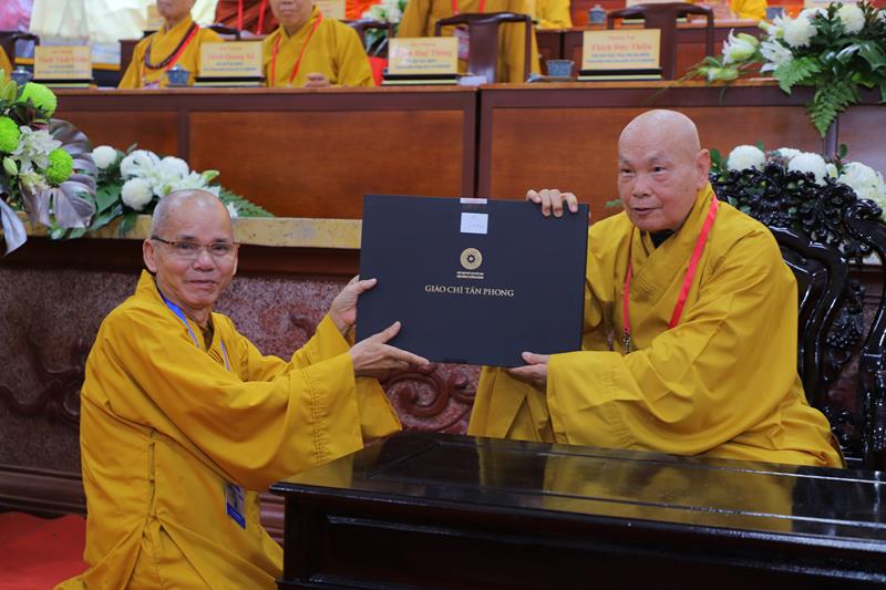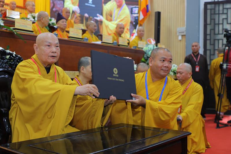 Trưởng lão Hòa thượng Thích Thiện Nhơn đại lao Đức Pháp chủ trao Giáo chỉ tấn phong đến đại diện Ban Trị sự 41 tỉnh, thành phố có Tăng Ni được tấn phong giáo phẩm.